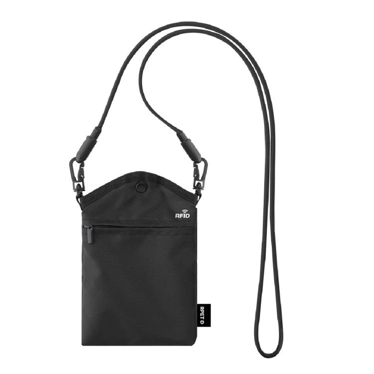 Portatodo fabricado en RPET. Compartimento principal con cierre de botón y bolsillo en la parte frontal con sistema de cierre en cremallera. Incluye sistema de protección RFID, diseñado para bloquear accesos no autorizados a tarjetas contactless.Cinta de transporte 2 en 1 unida mediante mosquetones con función de cable apto para transferir datos, con conexión Tipo C de 60W. Incluye distintivo logotipo RFID y RPET. (color negro)