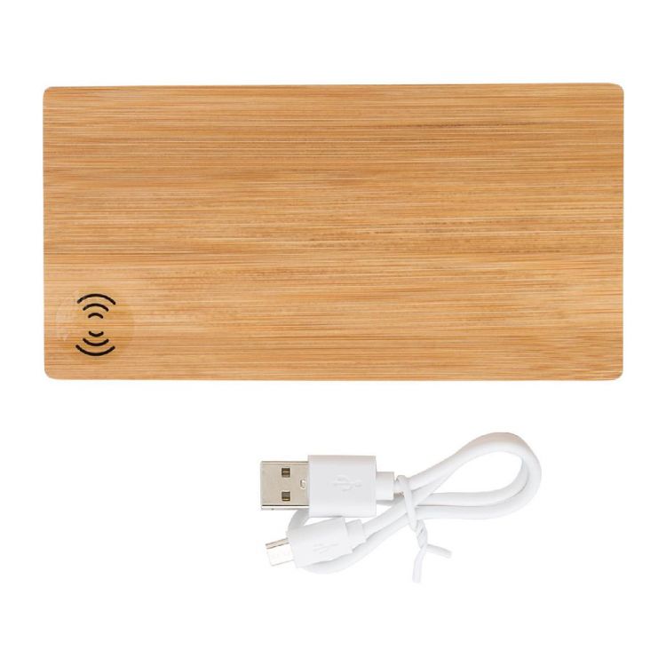 Power Bank de bambú, 6.000 mAh. Carga inalámbrica 5V /1A. Entrada DC5V / 2A, salida DC5V / 2A, batería de polímero de litio. Dos puertos USB e indicadores LED. Incluye cable de carga USB - micro USB.