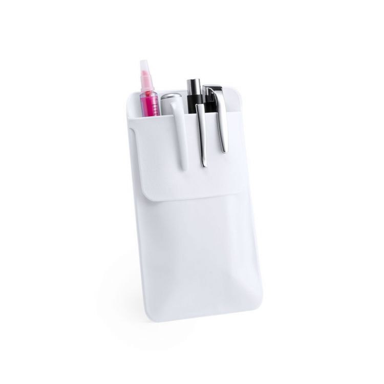 Protector de bolsillo para guardar bolígrafos y otros utensilios. En resistente PVC de acabado termosellado, con solapa para fácil impresión. (color blanco)