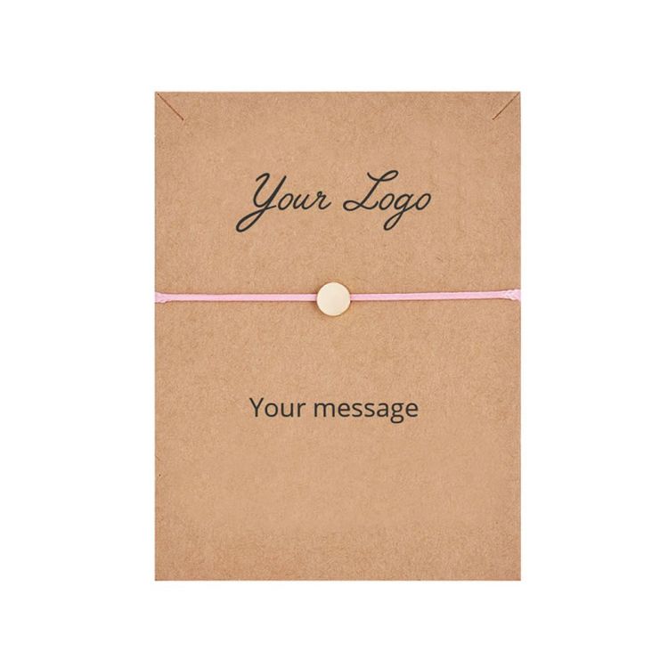 Pulsera colorida de cuerda fina y charm de metal (sin níquel). La pulsera es vendida faja de cartón reciclado que se puede personalizar por una cara con su propio mensaje de comunicación. Empaquetado individualmente en polybag transparente.
