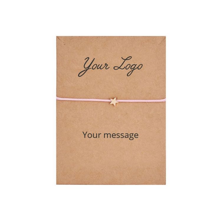 Pulsera colorida de cuerda fina y charm de metal (sin níquel). La pulsera es vendida faja de cartón reciclado que se puede personalizar por una cara con su propio mensaje de comunicación. Empaquetado individualmente en polybag transparente.