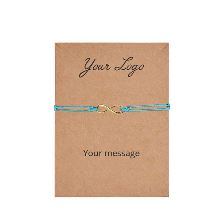 Pulsera colorida de cuerda fina y charm de metal (sin níquel). La pulsera es vendida faja de cartón reciclado que se puede personalizar por una cara con su propio mensaje de comunicación. Empaquetado individualmente en polybag transparente.