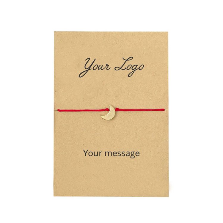 Pulsera colorida de cuerda fina y charm de metal (sin níquel). La pulsera es vendida faja de cartón reciclado que se puede personalizar por una cara con su propio mensaje de comunicación. Empaquetado individualmente en polybag transparente.