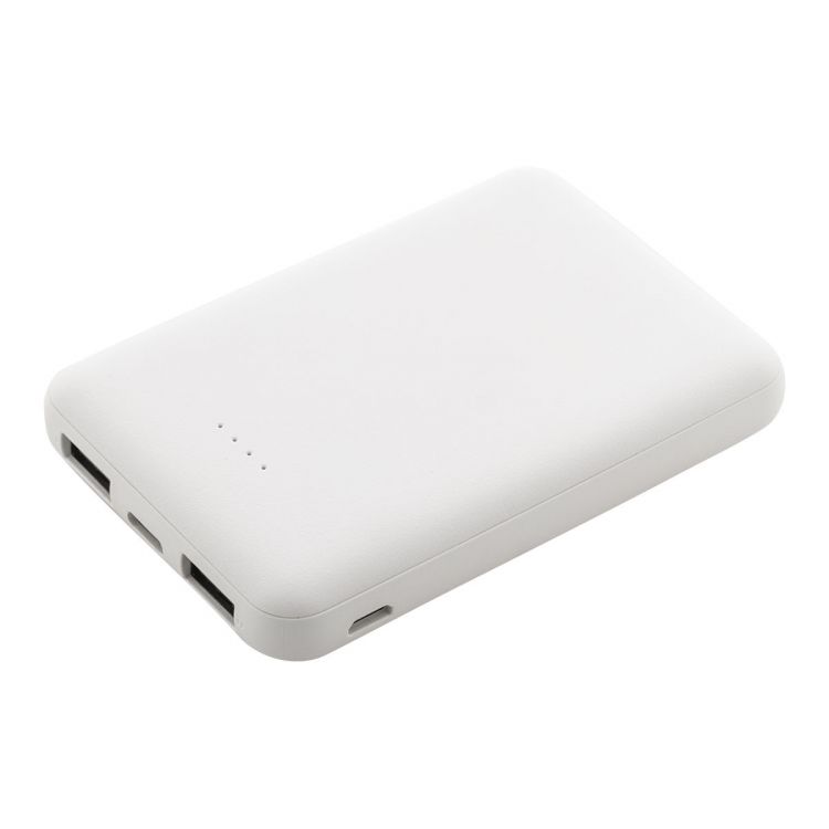 Batería externa de ABS reciclado con batería de 5000 mAh. Con 2 puertos de carga USB y 1 puerto de carga USB-C. Puertos de entrada micro USB y USB-C. Incluye cable de carga USB.