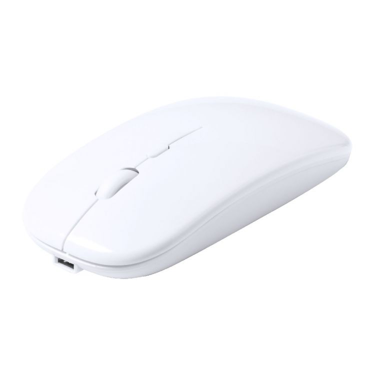 Ratón óptico inalámbrico con carcasa de plástico ABS reciclado y batería recargable integrada. Incluye cable cargador USB, de color blanco