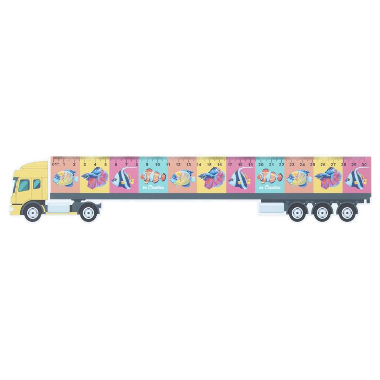 Regla de plástico flexible de 30 cm con forma de camión y gráficos personalizados. El precio incluye impresión LED UV por una cara. Cantidad mínima: 100 unidades