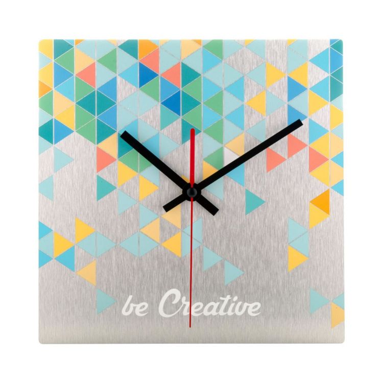 Reloj de pared compuesto de aluminio cepillado, hecho a medida, con gráfico personalizado en forma cuadrada. Funciona con 1 pila AA, sin batería. El precio incluye impresión LED UV. Cantidad mínima: 25 unidades
