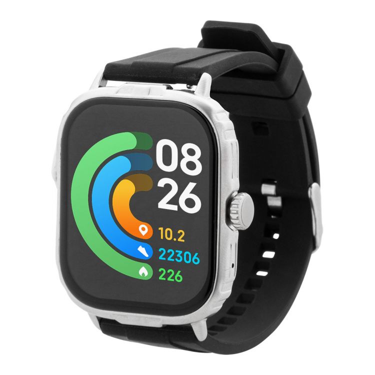 Reloj inteligente inalámbrico multifunción con carcasa metálica, pantalla táctil TFT de 2,01", batería recargable de 210 mAh y correa de silicona. Dispone de varias funciones inteligentes y de control de la salud, como frecuencia cardiaca, presión arterial y monitor de oxígeno, entre muchas otras. Se puede conectar a smartphones con una aplicación gratuita disponible para iOS y Android. Incluye cable de carga USB magnético. Resistente al agua IP65