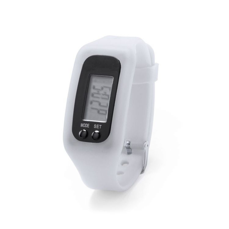 Desenfadado reloj digital de corte deportivo con pantalla LCD rectangular, correa ajustable de silicona y resistente a las salpicaduras de agua. Indicado para todo tipo de actividades deportivas y de ocio. Con pila de botón incluida y presentado en atractiva caja de diseño.