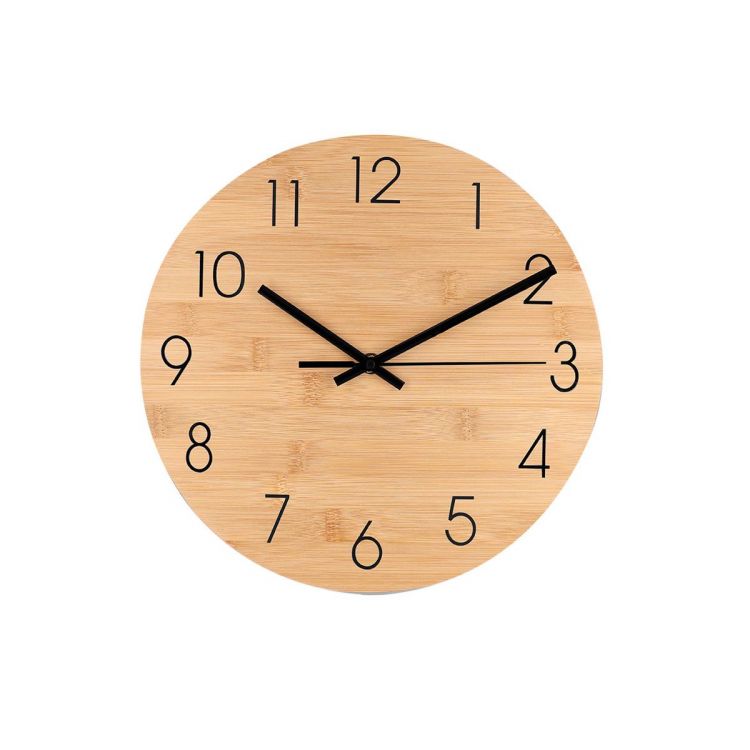 Reloj de pared en bambú natural, con números y dial metálico de color negro. Alimentación a pilas (1xAA no incluida).Materiales como el Bambú fomentan la utilización de materias primas naturales reduciendo las emisiones contaminantes. Además, el bambú proviene de una planta de gran resistencia y versatilidad, con crecimiento y regeneración rápida, siendo una excelente alternativa al uso de madera tradicional. (color natural)