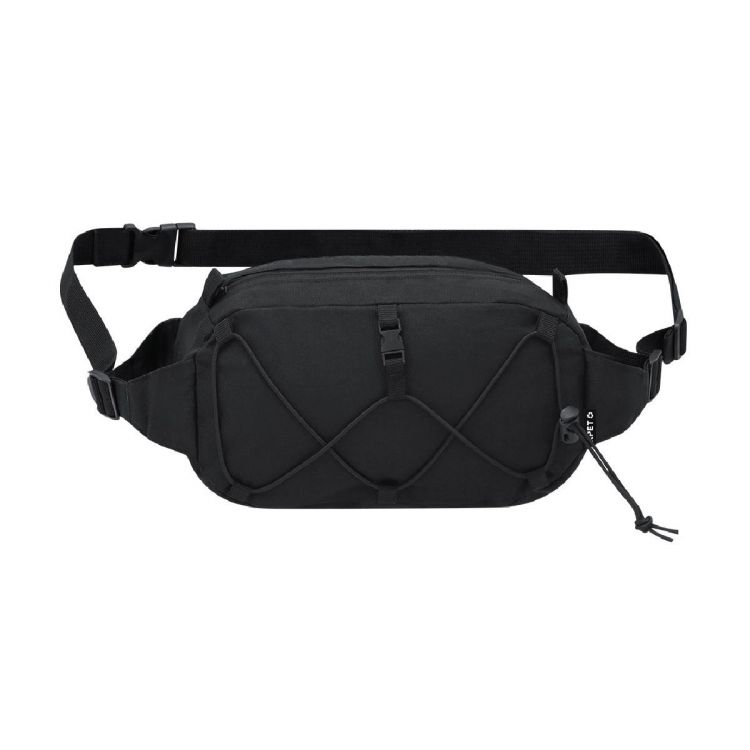 Riñonera fabricada en poliéster RPET 600D. Cuenta con un bolsillo principal con cierre de cremallera invisible en color negro, con tirador metálico en negro, y cinta ajustable con cierre de hebilla en la correa. En la parte frontal incluye un cordón elástico ajustable. Incluye etiqueta distintiva de RPET. (color negro)