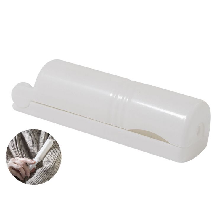 Rodillo quitapelusas plegable en estuche de polipropileno reciclado. Con rodillo de goma termoplástica lavable y reutilizable, de color blanco