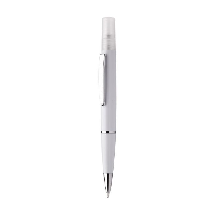 Bolígrafo de plástico con recambio azul y spray desinfectante en la parte superior. Capacidad: 3 ml. Se entrega sin líquido desinfectante, de color blanco