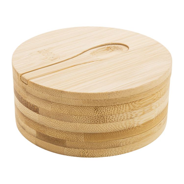 Salero y pimentero de bambú con dos compartimentos y tapa magnética giratoria. Incluye cuchara incorporada