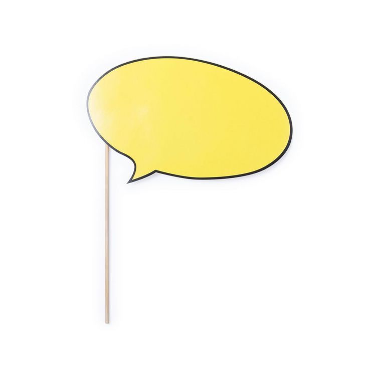 Selfie bocadillo en llamativo color amarillo con amplia superficie de impresión. En papel de alto gramaje con mango de madera. (color natural)