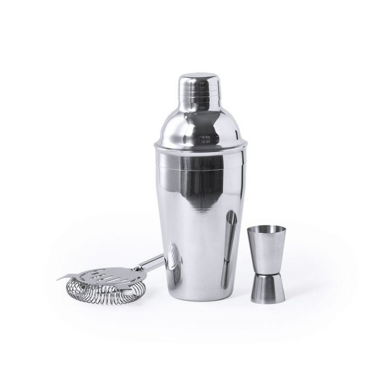 Set cóctel de 3 accesorios, fabricado en acero inox de acabado cromado. Incluye: Cocktelera de 550ml de capacidad, con cierre de seguridad y tapón dosificador en parte superior.Colador con asa.Medidor single/double. (color natural)