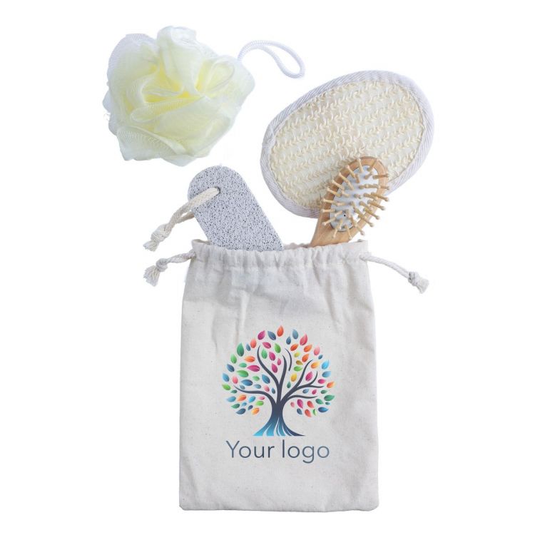 Set de baño de algodón con 4 piezas: cepillo de bambú, 2 esponjas y una piedra pómez (en bolsa). Presentado en una bolsa de algodón.