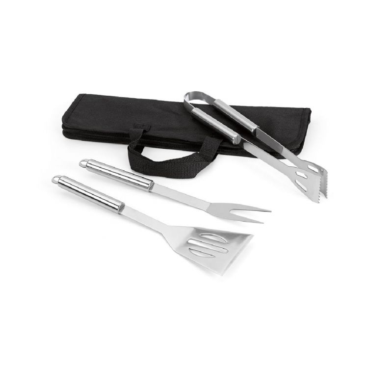 Set de barbacoa que incluye 3 piezas en acero inoxidable: tenazas, tenedor y espátula. Se suministra en una bolsa de tela no tejida (non woven) con asas. Funda: 405 x 120 x 25 mm. Producto en color negro
