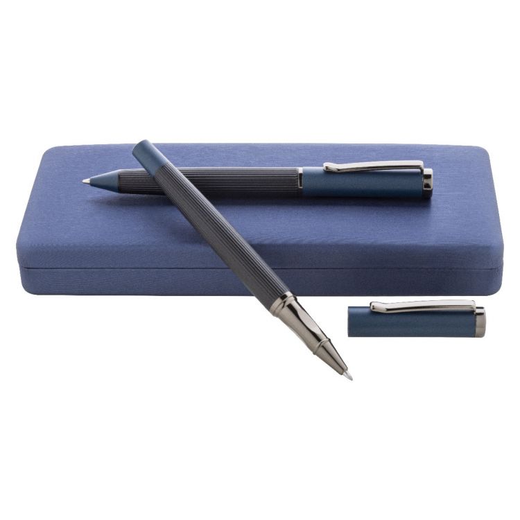 Elegante juego de bolígrafo y roller metálicos con cuerpo rayado, detalles de color y detalles brillantes en color gris plomizo. En caja de regalo a juego, escritura azul. Producto de la marca André Philippe.