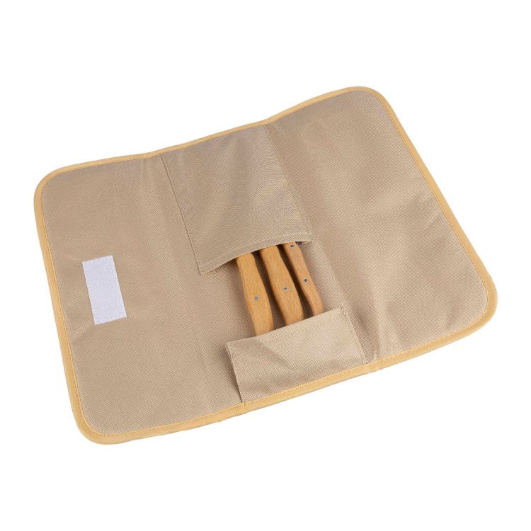 Juego de cuchillos para quesos o charcutería presentado en una bolsa de rPET 600D con cierre de velcro. Incluye tres cuchillos de acero inoxidable con mangos de madera. Cuenta con una etiqueta indicando que es material rPET en el interior. Apto para alimentos. Presentado en una caja de cartón marrón.