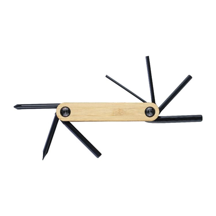 Multiherramientas de acero al carbono con detalles de bambú. Incluye 7 herramientas: llaves Allen, destornillador Phillips y destornillador de punta plana. Presentado en una caja de cartón marrón.
