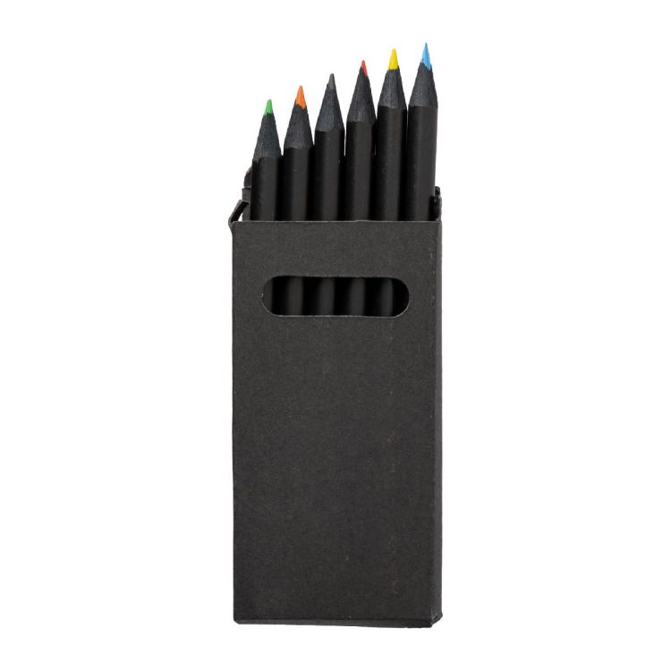 Caja negra de cartón reciclado con 6 lápices de colores.