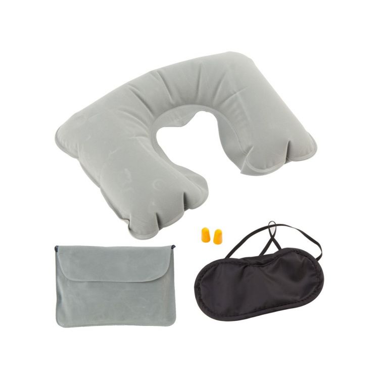 Set de viaje con almohada de viaje hinchable, antifaz y tapones para los oídos. Se entrega en un estuche de terciopelo del mismo color.