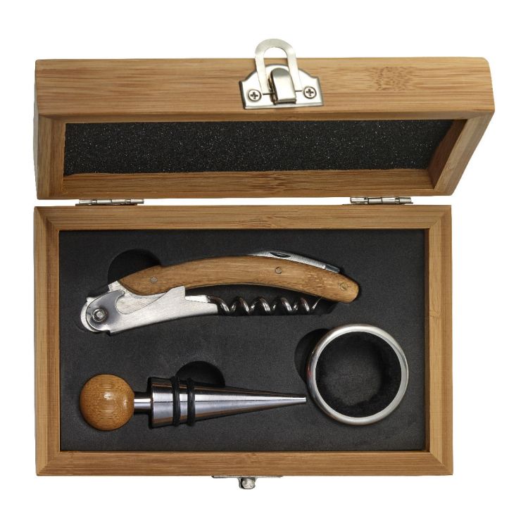 Set de vino de acero inoxidable y bambú: sacacorchos, argolla antigoteo y tapón. Presentado en una caja de bambú.