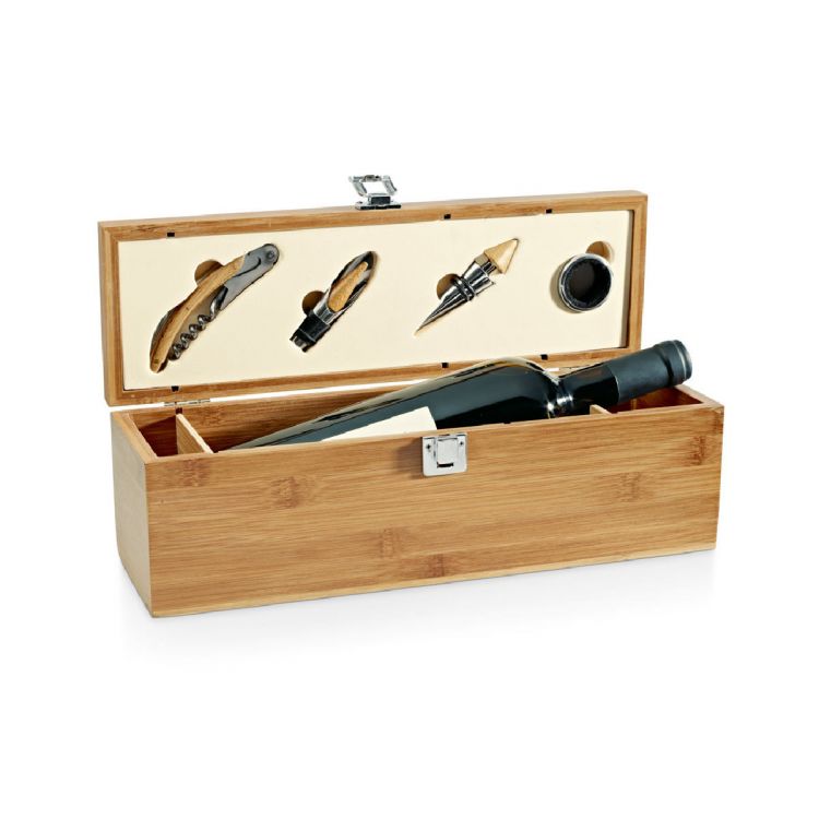Set de vino suministrado en caja, fabricado en bambú, zinc y acero inoxidable. En su interior incluye un sacacorchos con navaja sommelier, una gargantilla recoge gotas, un dosificador y un tapón. Como el producto está fabricado con materiales naturales, el color como el resultado de la impresión pueden variar entre unos y otros productos. 363 x 112 x 119 mm. Producto en color natural