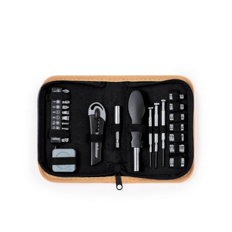 Set de herramientas de 24 accesorios en estuche de corcho con interior ordenado por elásticos. Incluye llaves de tubo, destornilladores de precisión (plano y philips), mango multifunción con diversas puntas intercambiables (extensión, cabezales philips, planos, de estrella y adaptador), cúter y un metro. Presentado en caja de diseño kraft.Elaborado con elementos vegetales para así fomentar la utilización de materias primas naturales y reducir las emisiones contaminantes. (color natural)