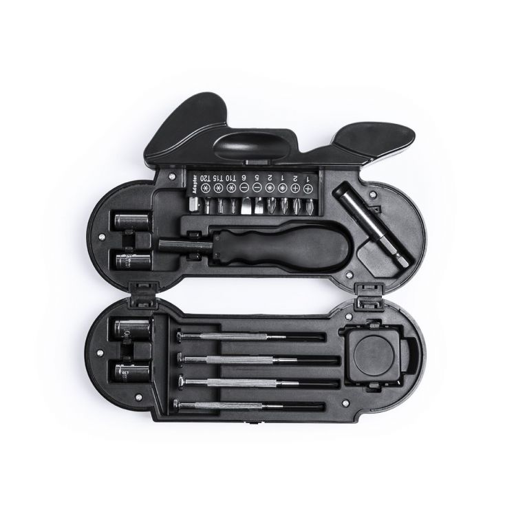 Set de herramientas de 14 accesorios en resistente estuche con diseño de moto, con linterna de 4 ledes integrada. Incluye set de destornilladores de precisión, herramienta de fijación, cabezales destornilladores planos y de estrella y llaves para tuercas de cabeza hexagonal. Pilas de botón incluidas. Presentado en caja individual. (color natural)