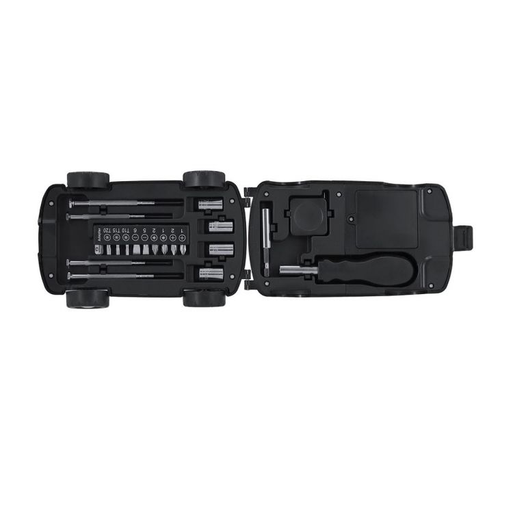 Set de herramientas con estuche en forma de coche y linterna LED. Con 20 herramientas. Incluye: - Set de destornilladores de precisión (planos y philips)- Herramienta de fijación- Mango multifunción con cabezales de destornilladores planos y de estrella-Llaves para tuercas de cabeza hexagonal-FlexómetroCon linterna con 2 LEDs integrada en el escuche, alimentada por 4 pilas AAA (no incluidas). (color negro)