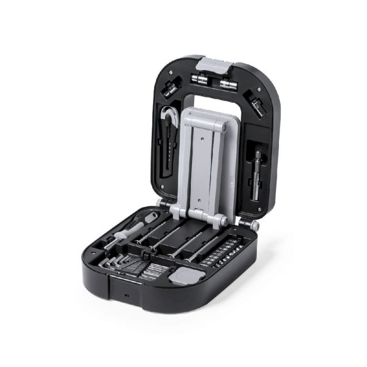 Original set de herramientas con luz y 30 accesorios. Presentado en resistente caja de ABS negra con cierre. Lámpara plegable integrada la caja, con 24 LEDs y botón ON/OFF. Incluye destornillador con multitud de puntas planas, philips, torx… Con kit de destornilladores de precisión llaves de tubo y llaves allen en distintas medidas cutter y flexómetro 1m. Lampará con alimentación a pilas (3xAA no incluidas). Presentado en caja individual de diseño kraft. (color negro)