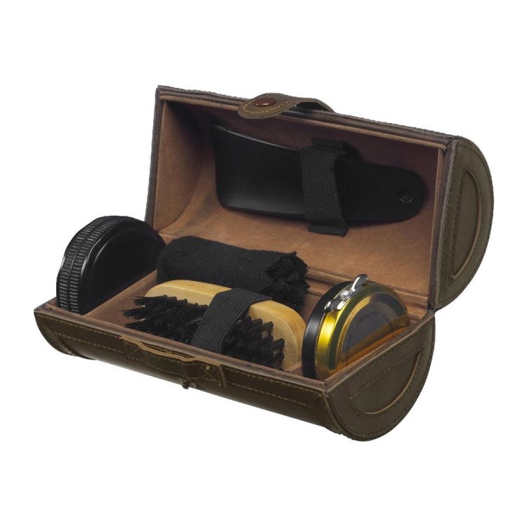 Set limpia calzado con cepillo, calzador, cera, esponja de brillo y gamuza. Presentado en un elegante estuche de polipiel.