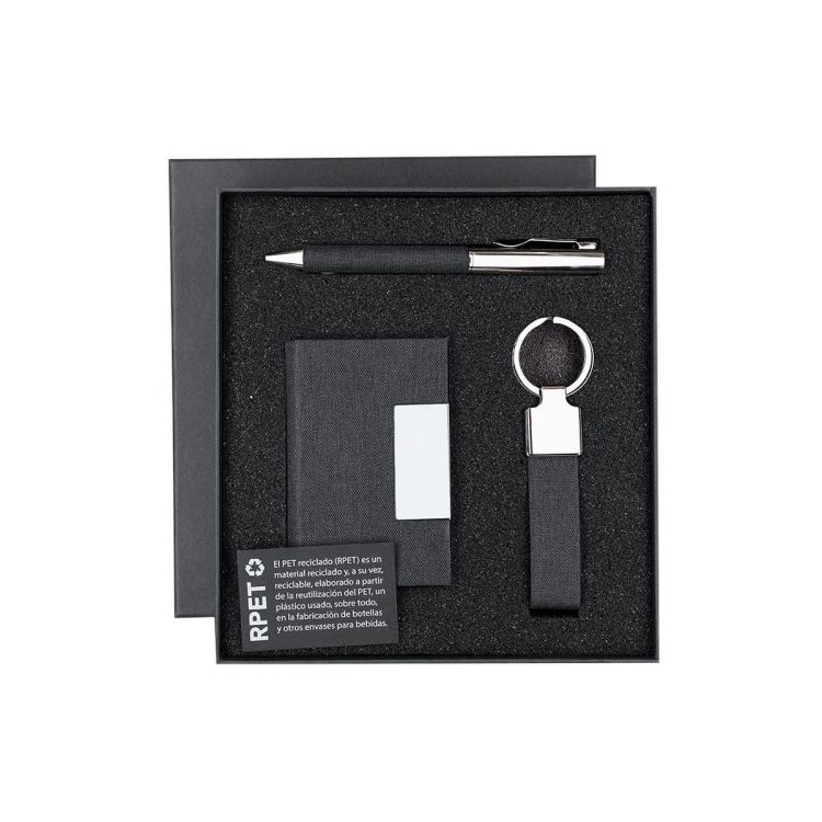 Elegante set en RPET con acabado negro bitono y detalles metálicos. Incluye:-Tarjetero de RPET con exterior negro bitono combinado y detalle metálico, 1 compartimento interior y sistema de cierre magnético.-Bolígrafo de RPET de acabado negro bitono y detalles metálicos. Con mecanismo giratorio y tinta azul.-Llavero en RPET de acabado color negro bitono y accesorios cromados.Presentado en estuche individual negro. Incluye tarjeta negra interior con distintivo RPET.El material RPET se elabora a partir de plástico reciclado, para así fomentar la reutilización de residuos plásticos y ayudar a la sostenibilidad del planeta. (color negro)