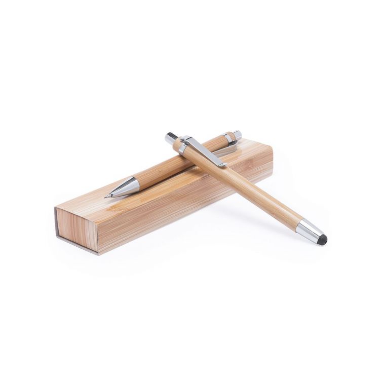Set de bolígrafo de mecanismo pulsador y portaminas en original combinación de cuerpo en madera de bambú natural y accesorios de acabado metálico en color plateado brillante. Presentado en estuche individual troquelado de cartón brillante con acabado símil madera. Bolígrafo de cartucho jumbo con tinta azul y portaminas con minas de 0,7mm incluidas. (color natural)