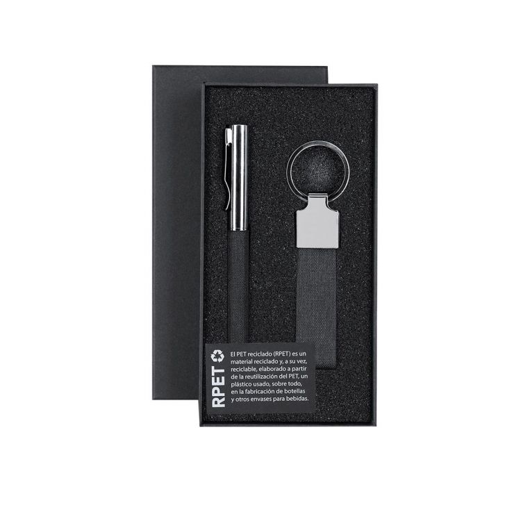 Elegante set en RPET con acabado negro bitono y detalles metálicos. Incluye:-Bolígrafo de RPET de acabado negro bitono y detalles metálicos. Con mecanismo giratorio y tinta azul.-Llavero en RPET de acabado color negro bitono y accesorios cromados.Presentado en estuche individual negro. Incluye tarjeta negra interior con distintivo RPET.El material RPET se elabora a partir de plástico reciclado, para así fomentar la reutilización de residuos plásticos y ayudar a la sostenibilidad del planeta. (color negro)