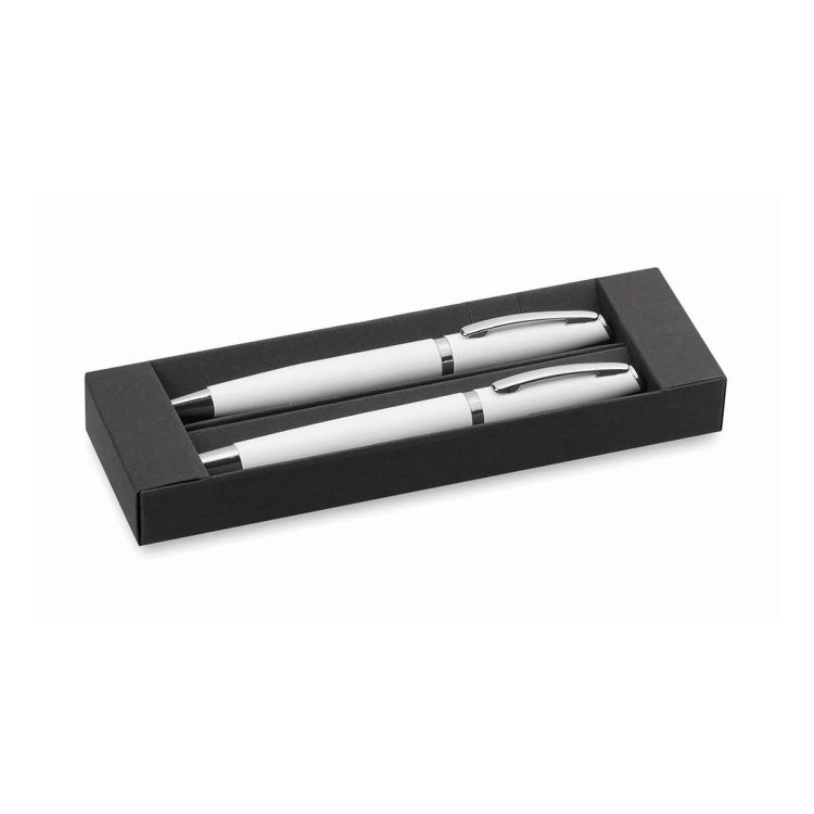 Elegante set de bolígrafo de mecanismo giratorio y roller de capucha en sobrio diseño. De cuerpo de aluminio en suave acabado con accesorios en colores plateados. Presentado en estuche individual de cartón con funda en color negro. Bolígrafo con cartucho jumbo. En tinta azul.