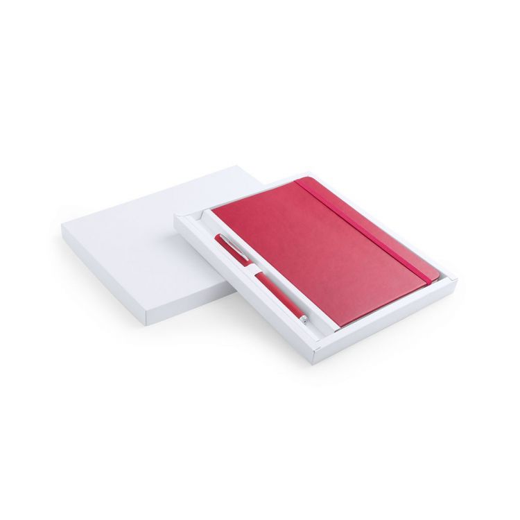 Set de bloc de notas con tapas de suave tacto acabadas en polipiel y bolígrafo de suave cuerpo a juego. De 100 hojas lisas con elástico de sujeción y marcapáginas de tela a juego. Presentado en elegante estuche de cartón blanco troquelado. Bolígrafo en tinta azul.