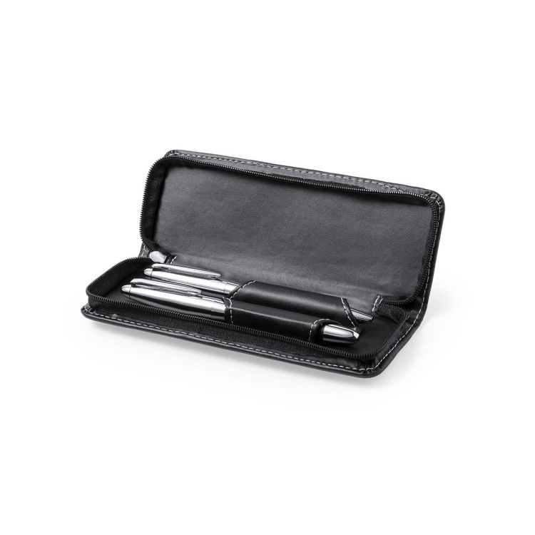 Set premium de bolígrafo y roller. Fabricado en elegante combinación de polipiel en tonos negros y metal cromado. Bolígrafo de mecanismo giratorio en tinta azul y con cartucho jumbo. Roller con capucha y tinta gel en azul, carga jumbo. Presentado en estuche individual de polipiel con cierre de cremallera e interior a juego con compartimentos individuales. (color negro)