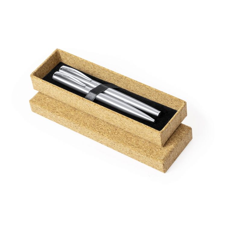 Set de bolígrafo y roller fabricados en Acero Inox Reciclado. Bolígrafo de mecanismo giratorio y roller con capucha, ambos con clip metálico y en tinta azul, con cuerpo de acabado brillante y logotipo Acero Inox Reciclado incluido. Presentados en un estuche de corcho.El acero es uno de los materiales más demandados y que puede encontrarse casi en todas partes, desde productos de uso diario a grandes construcciones. Con innumerables propiedades, entre las que cabe destacar la durabilidad y su alto grado de reutilización, convirtiéndolo en una alternativa muy valorada en soluciones de sostenibilidad. Debidamente tratado, permite obtener nuevos recursos de infinita utilización. (color natural)