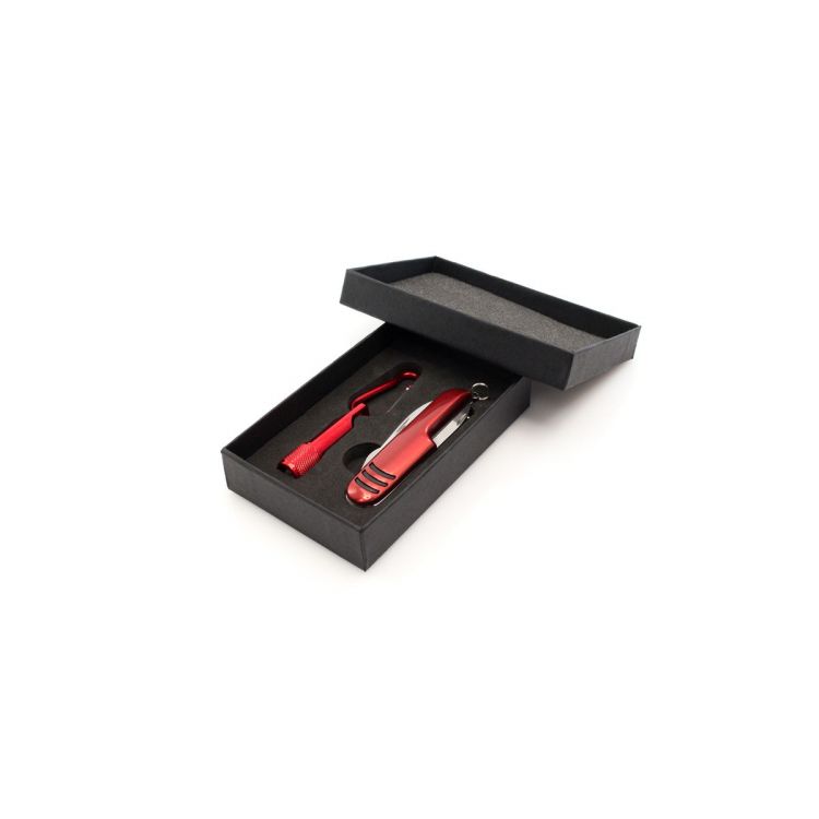 Set de aluminio de navaja multiusos con 7 funciones y linterna mosquetón. En variados colores y presentado en estuche individual con ventana y suave espuma interior troquelada. Pilas de botón incluidas.