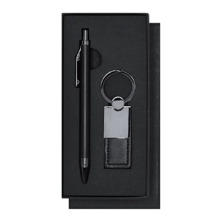 Elegante set premium que incluye:Bolígrafo en Aluminio Reciclado de acabado negro mate, de mecanismo pulsador y tinta azul. Con clip y puntera en pulido ABS. Incluye distintivo Aluminio reciclado.Elegante llavero con cinta fabricada en poliéster PU y accesorios cromados. (color negro)
