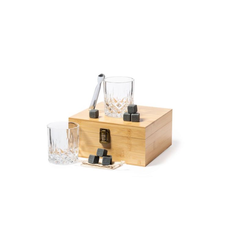 Set de whisky en elegante estuche de bambú con interior troquelado. Incluye 2 vasos de cristal de 320 ml, pinzas y 8 cubitos en piedra natural reutilizables, con funda de algodón. Presentación en caja individual de diseño kraft. Los cubitos reutilizables están fabricados en piedra natural esteatita, también conocida como piedra o roca de jabón, que mantiene la bebida fría sin alterar sus propiedades al no diluir su contenido en agua, además de mantener el sabor original de la misma. (color natural)