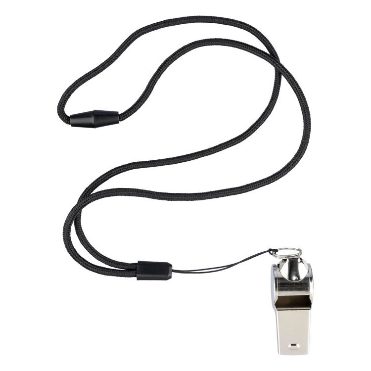 Silbato de metal con cordón de poliéster y hebilla de seguridad de plástico. Presentado en una caja de cartón marrón.