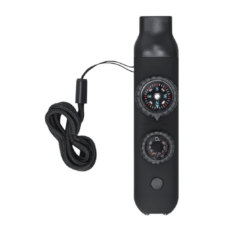 Silbato de supervivencia fabricado en resistente ABS con acabado gomoso. Integra 6 funciones esenciales:- Brújula de 2,55 cm de diámetro, con indicaciones de Norte, Sur, Este y Oeste.- Silbato de alta potencia, ideal para emitir señales de emergencia.- Termómetro con rango de temperaturas de -20 ºC a 50 ºC.- Lupa de 2 cm de diámetro, perfecta para observar detalles pequeños o incluso para encender fuego mediante concentración de luz solar.- Espejo, incorporado en la parte inferior de la brújula.- Linterna con 2 LEDs y botón de encendido/apagado en la parte superior.Incluye un práctico cordón para facilitar su transporte, ideal para llevarlo cómodamente colgado al cuello. (color negro)