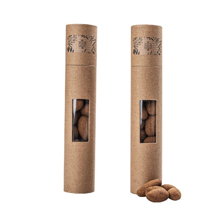 Paquete de frutos secos. Los colores corresponden al tipo de snack: Rosa - trozos de fresa recubiertos de chocolate blanco espolvoreados con polvo de fresa (45 g), Marrón oscuro - granos de café recubiertos de chocolate negro (70 g), Chocolate - grosellas recubiertas de chocolate negro espolvoreadas con Cacao (70 g), Color avellana con avellanas caramelizadas recubiertas de chocolate negro (70 g), Color arena con trozos de albaricoque recubiertos de chocolate negro espolvoreados con cacao (70 g), Cobre con pasas recubiertas de chocolate blanco espolvoreadas con cacao (70 g ), de café (75 g), Bronce con piel de naranja recubierto de chocolate negro con un toque de Earl Grey (70 g), Beige con avellanas recubierto de chocolate negro con caramelo de menta (70 g). Paquete: Caja de papel kraft con ventana transparente en el frente. Posibilidad de personalización de la etiqueta adhesiva para aplicar en la tapa (acabado del papel: blanco o kraft, a elegir en el momento del pedido). Vida útil mínima: 6 meses.