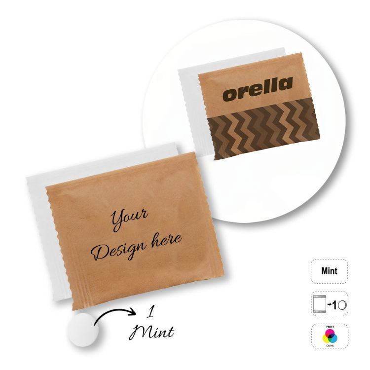 Bolsita rectangular que contiene caramelos de menta masticables. Las letras del código de producto corresponden al número de caramelos de menta que contiene: A- 1 caramelo de menta, B- 2 caramelos de menta, C- 3 caramelos de menta. Bolsita alimentaria totalmente personalizable con una selección de: papel blanco o transparente 100% compostable o papel kraft (elección del acabado al hacer el pedido). Caducidad mínima: 12 meses.
