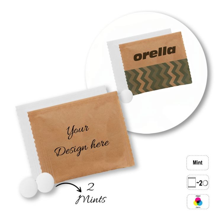 Bolsita rectangular que contiene caramelos de menta masticables. Las letras del código de producto corresponden al número de caramelos de menta que contiene: A- 1 caramelo de menta, B- 2 caramelos de menta, C- 3 caramelos de menta. Bolsita alimentaria totalmente personalizable con una selección de: papel blanco o transparente 100% compostable o papel kraft (elección del acabado al hacer el pedido). Caducidad mínima: 12 meses.