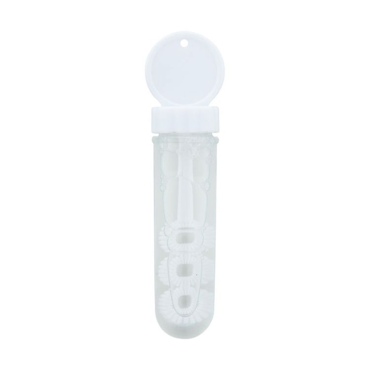 Soplador de burbujas de plástico coloreado. Con 30 ml de líquido para burbujas.